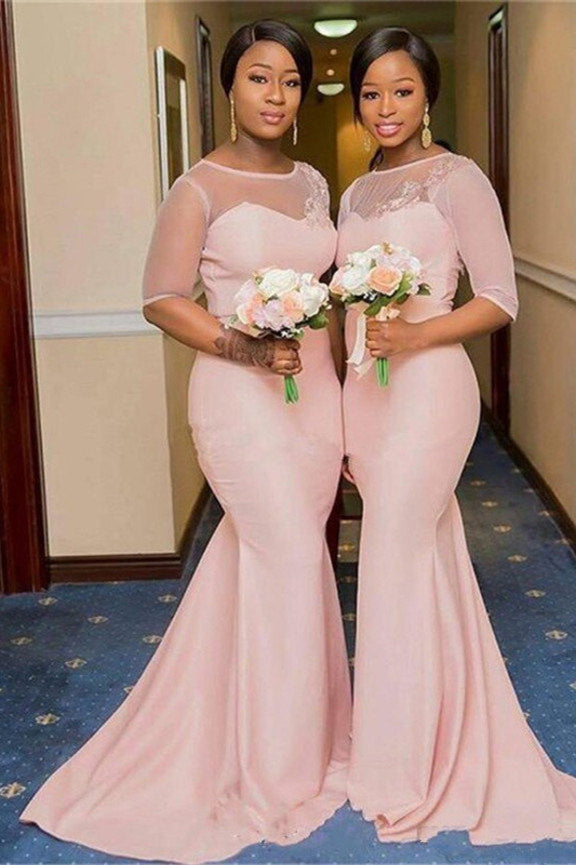 Mermaid Round Lace Applique Floor Length Half Sleeves Bridesmaid Dress
