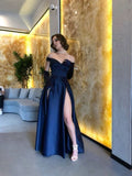 A-Line Navy Blue Long Satin Prom Dress Formal Gown